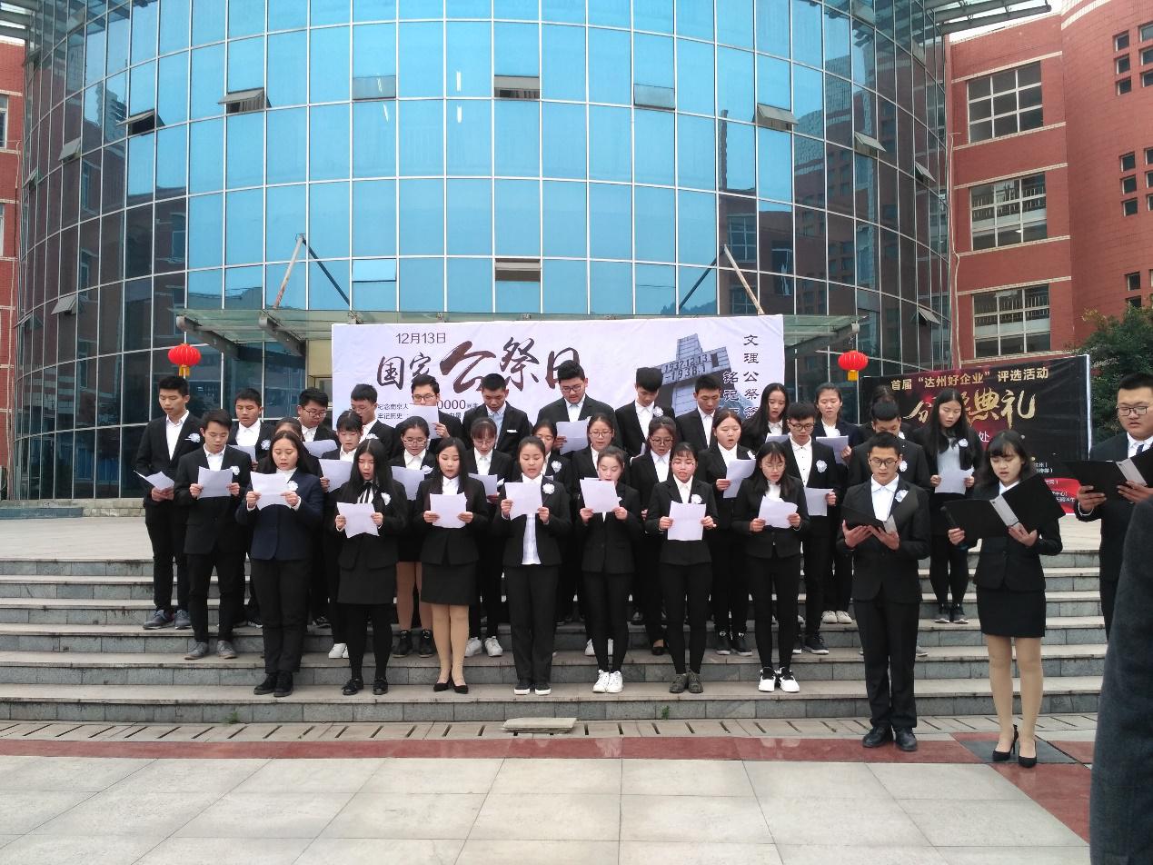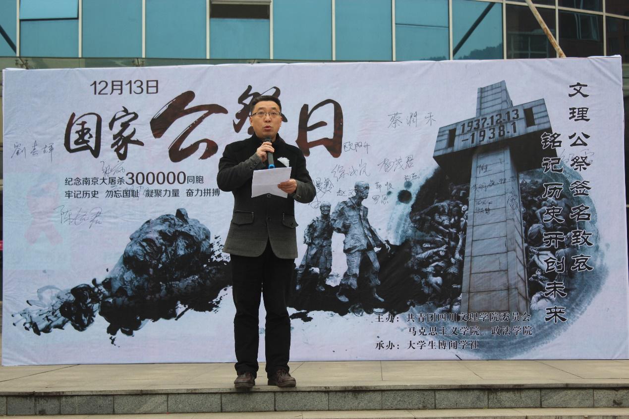 12月13号上午10点,由校团委与我院联合主办、博闻学社承办的以“铭记历史,珍爱和平;警惕右翼,复兴中华”为主题的南京大屠杀80周年公祭仪式在音乐广场隆重举行。仪式由院党总支副书记张善喜主持,党总支书记刘春辉、青年教师代表张岚、学院150余名学生代表,大学生博闻学社等社团50名社团代表参加公祭仪式。