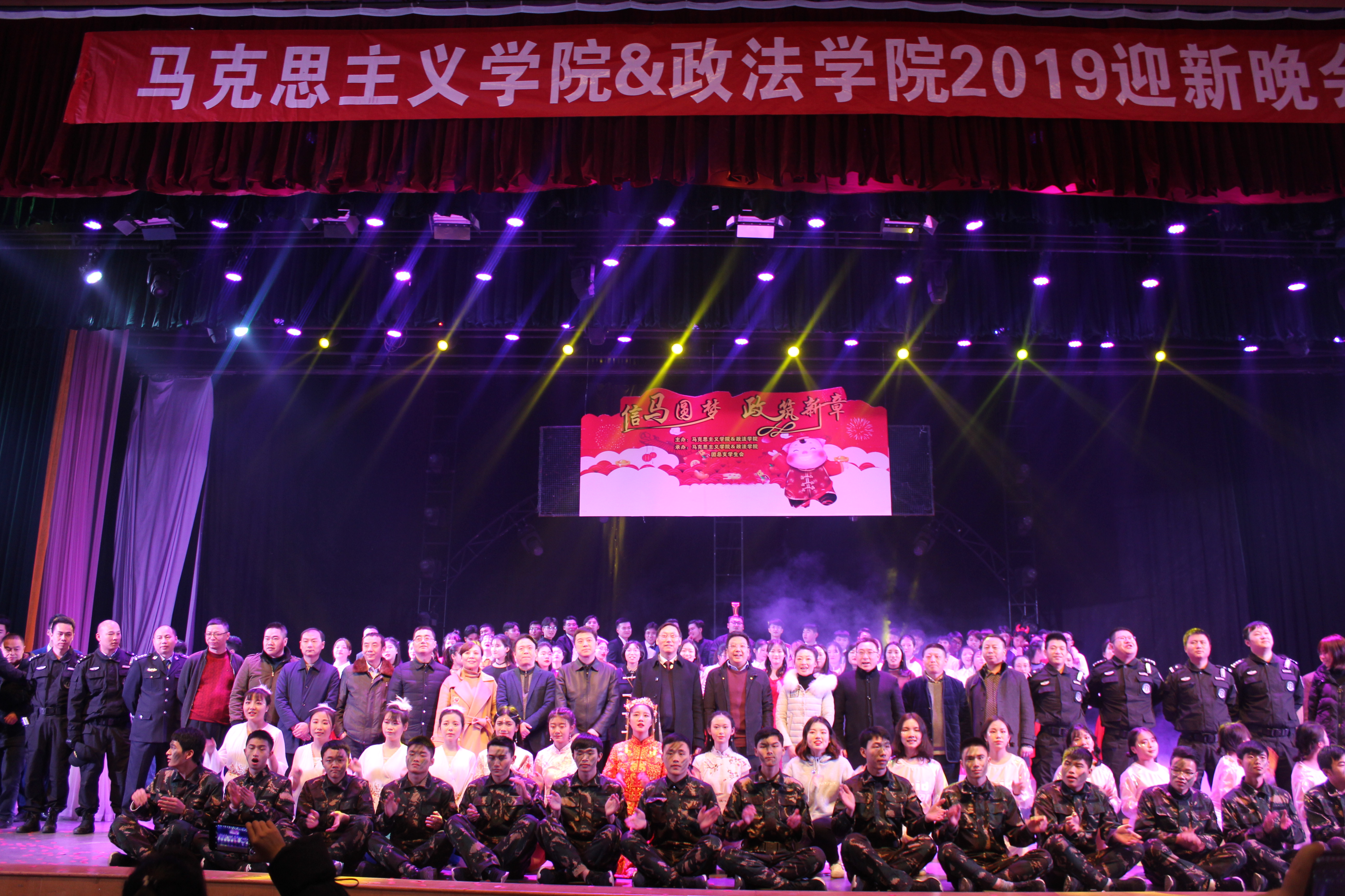 2018年 12月17日19:00,马克思主义学院&政法学院在莲湖校区音乐演播厅举办庆祝改革开放40周年2019年“信马圆梦 政筑新章”迎新晚会。学校党委书记王成端教授、副校长李壮成教授、达川区人民法院黎泽心院长、通川区一小莲湖学校张冲校长、四川果然律师事务所田金陇主任、法之缘律师事务所周忻主任、达州铁路中学雷秋艳老师、学校党委互联网思政部团委于贵书记、学生工作部(处)陈官章部(处)长、四川革命老区研究中心刘长江主任、校地合作处王小奎处长、评估处文学运副处长及赞助商西柚美学摄影馆和悦诗风吟负责人莅临晚会现场,学院党政领导全体老师及各二级学院师生代表观看了晚会。