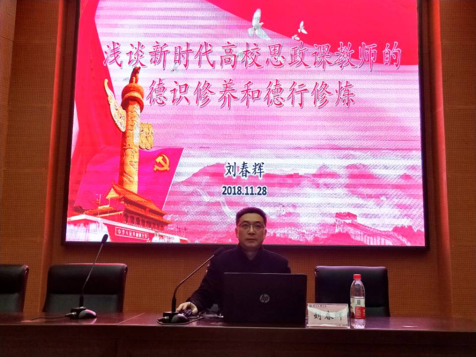 2018年 11月28日晚,马克思主义学院、政法学院党总支书记刘春辉在学术报告厅B厅作了题为“浅谈新时代高校思政课教师的德识修养和德行修炼”的学术讲座。学术报告由党总支副书记吴辉兵主持,学院部分教师和大一、大三学生聆听了讲座。
