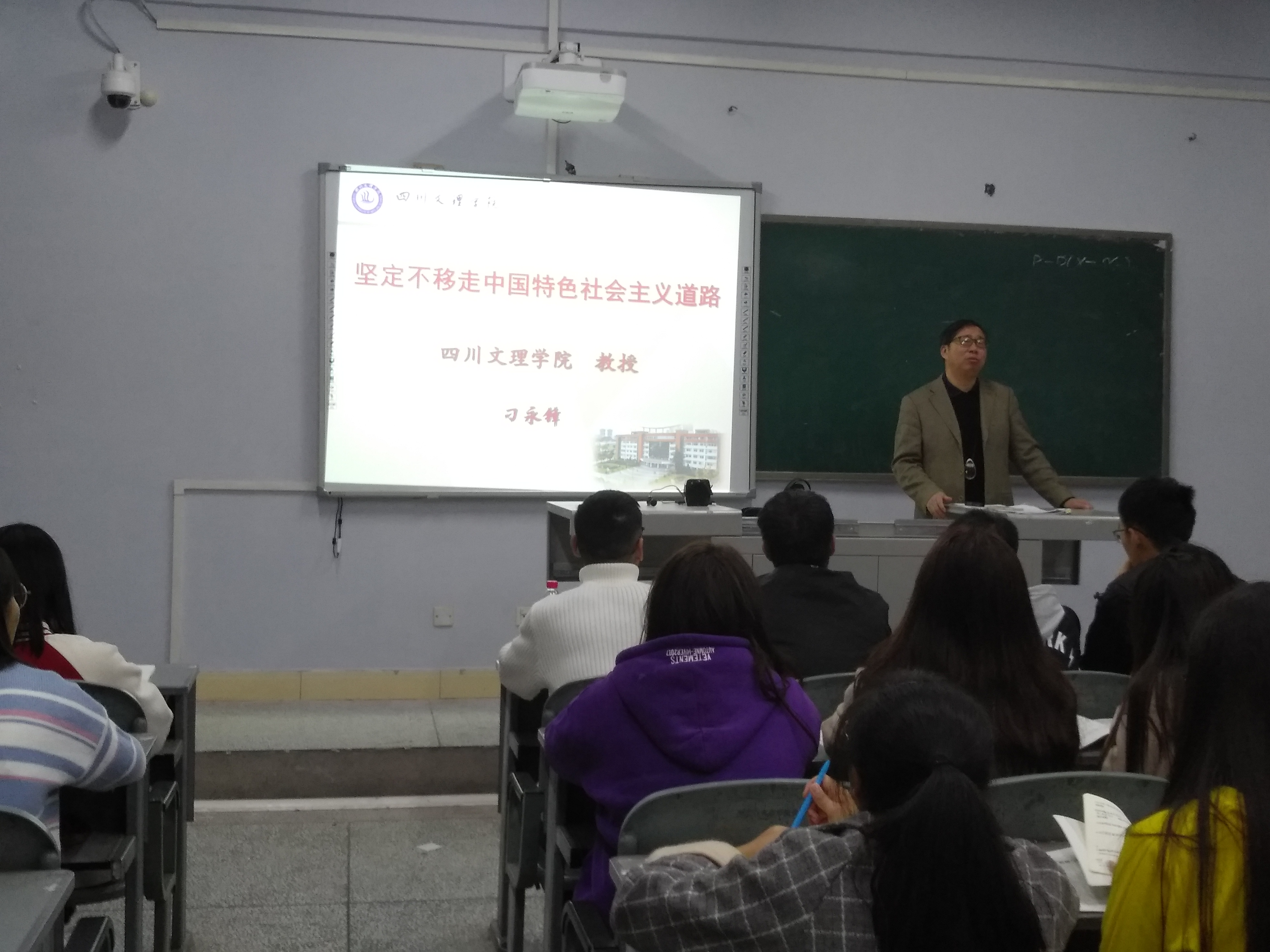 2018年11月12日晚,学校校长、四川省有突出贡献的优秀专家刁永锋教授在一教楼208教室为财经管理学院2017级1、2、8班同学讲授题为“坚定不移走中国特色社会主义道路”的形势与政策课。财经管理学院党总支副书记(主持工作)李兴贵老师、马克思主义学院形势与政策教研室主任梁云老师、辅导员魏晓军老师一同聆听了刁校长的授课。