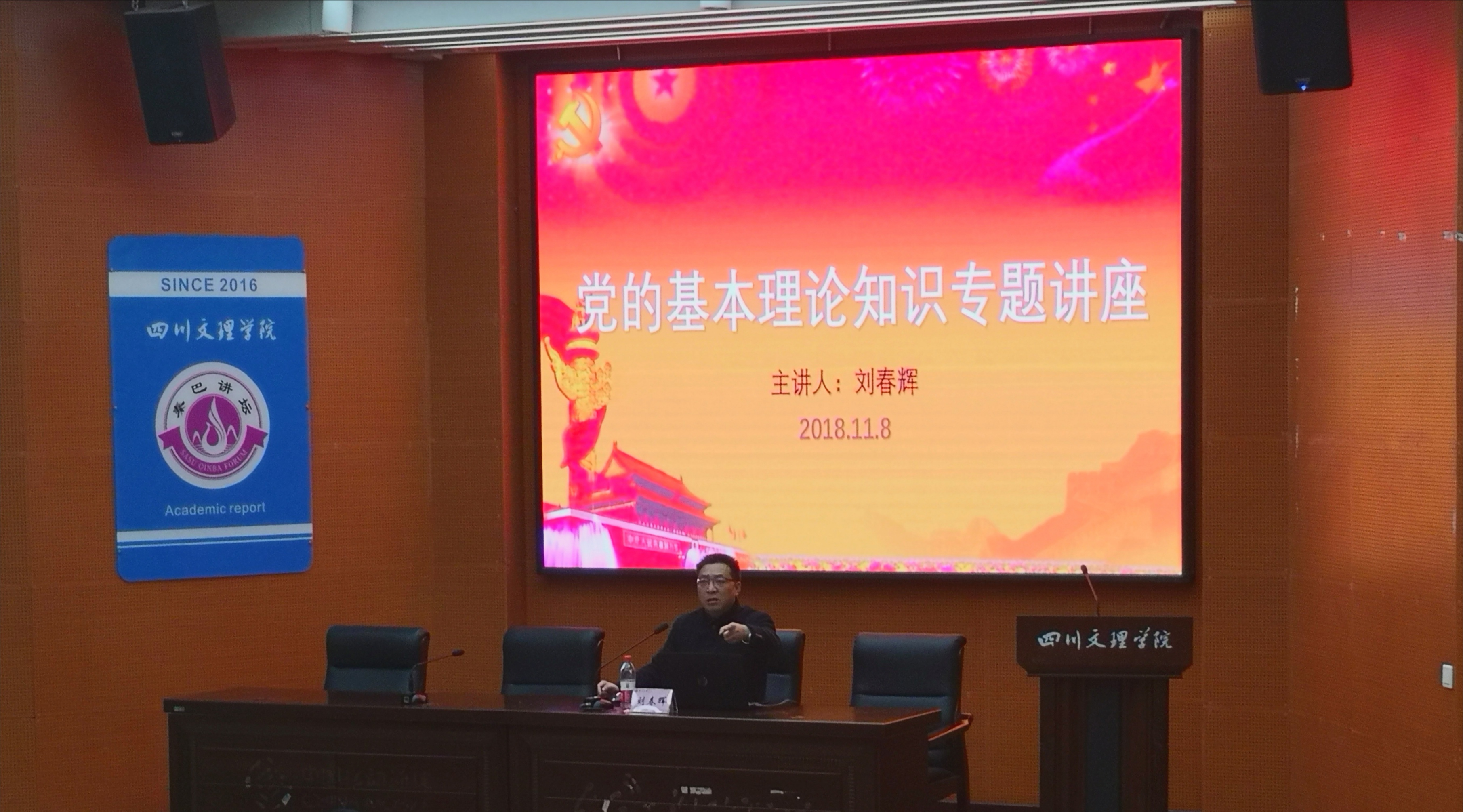 11月8日晚6:30,马克思主义学院、政法学院党总支书记刘春辉老师在莲湖校区学术报告厅B厅为学院大一学生作题为党的基本理论知识专题讲座。党总支副书记吴辉兵、学工办主任唐幸福、辅导员刘丹老师出席讲座。2018级全体学生到场聆听。讲座由党总支副书记吴辉兵主持。
