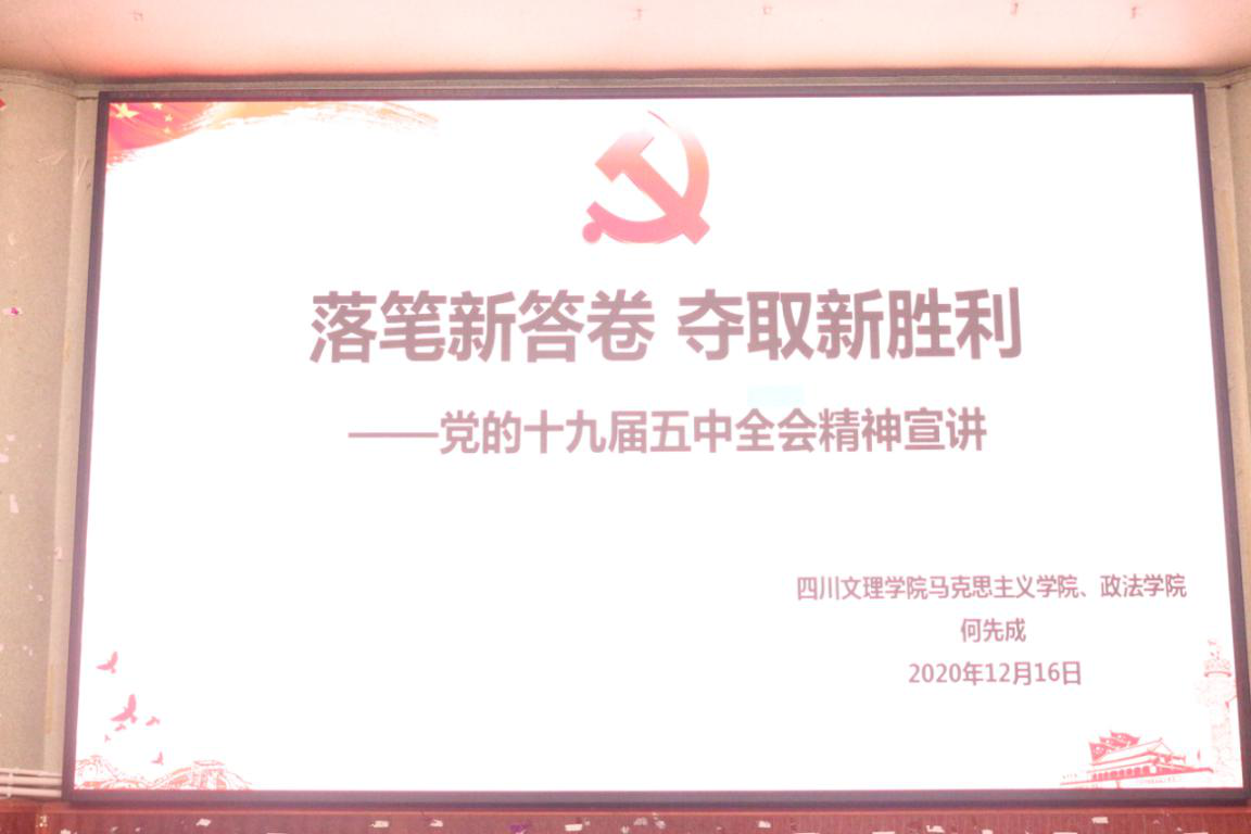 为引导新时代大学生更好地学习了解党的十九届五中全会精神,12月16日上午10:00,副院长何先成博士在南坝校区学术报告厅以“落笔新答卷,夺取新胜利”为主题为外国语学院2020级全体学生进行党的十九届五中全会精神宣讲。外国语学院2020级辅导员刘欣蕾老师主持宣讲会。