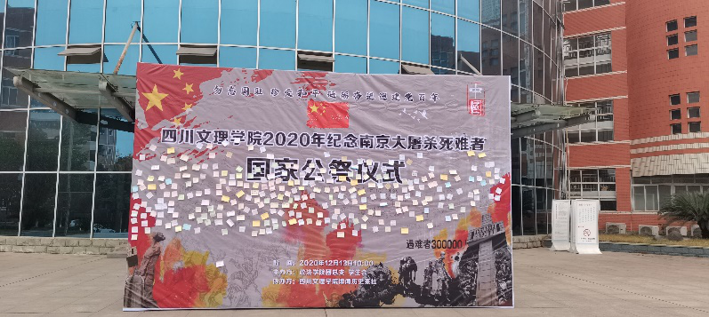 为了纪念那段满是血泪的历史,马克思主义学院&政法学院主办,四川文理学院博闻历史茶社承办的四川文理学院2020年纪念南京大屠杀死难者国家公祭仪式于2020年12月13日10:00在莲湖校区音乐广场举行。我院党总支副书记吴辉兵、副院长何先成、党政办主任李会敏、学工办主任唐幸福、历史教研室主任王盟、思想政治教育教研室主任曹红梅、历史教师张涛出席,19级、20级全体学生和各社团、社联等代表参加。