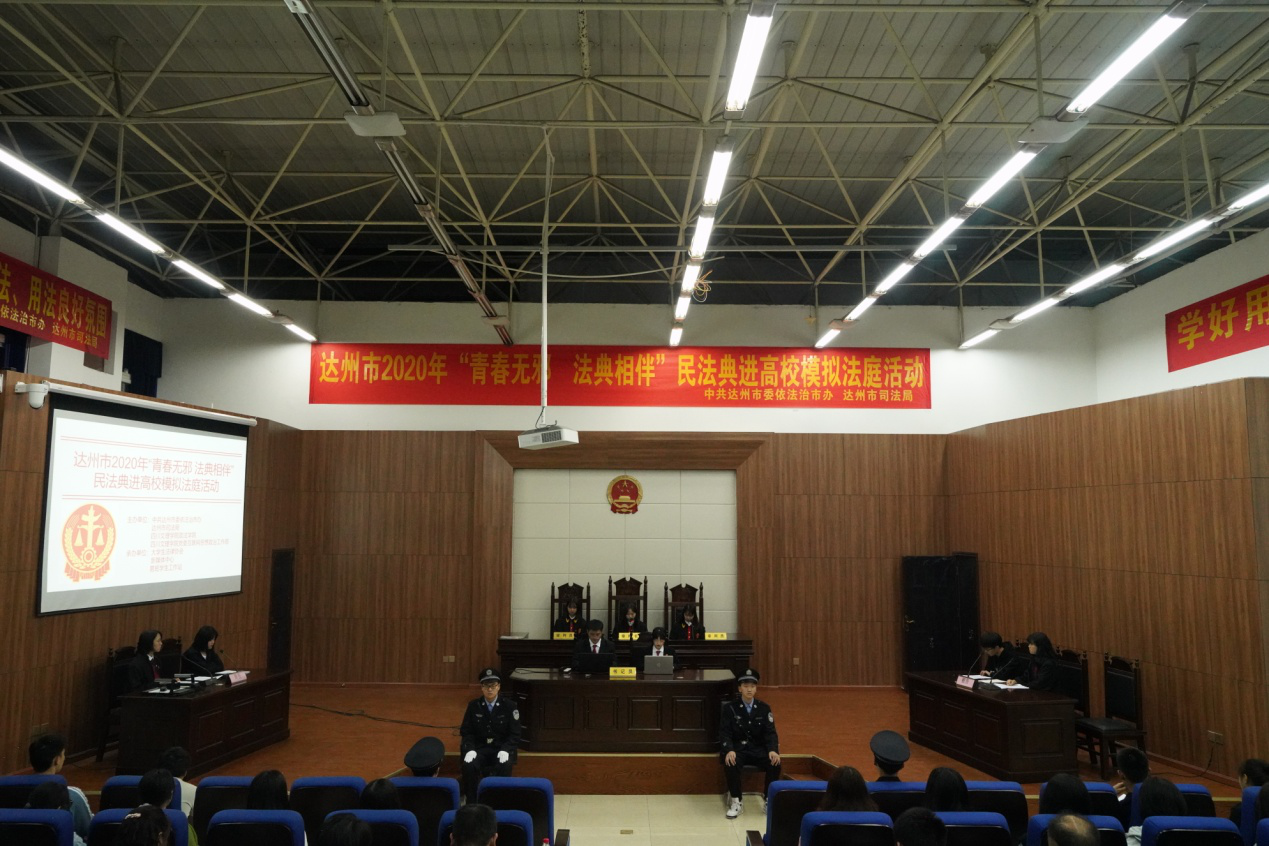 为深入贯彻习近平总书记“广泛开展民法典普法工作”重要指示,认真落实中央和省委民法典普法宣传决策部署,全面提升基层社会治理能力水平,同时进一步加强对大学生的法律意识培养和反邪教宣传教育,10月27日晚,学院在博文楼113室举办达州市2020年“青春无邪 法典相伴”民法典进高校模拟法庭活动。中共达州市委全面依法治市办副主任、市司法局党委委员、副局长杨忠出席并讲话,达州市律师协会副会长、四川奥飞律师事务所主任周忠梅出席并作精彩点评,学院党总支书记刘春辉出席并致辞。