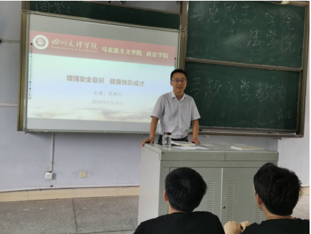 党总支副书记吴辉兵作《增强安全意识,健康快乐成长》讲座,他运用校园案例从人身、财产、交通和消防等方面对新生进校安全教育,教育学生树立安全意识,增强防范技能;普及新冠防疫知识,要求同学们加强疫情防控,确保生命安全和身体健康;要求同学遵守校规校纪,增加纪律意识意识和法治意识;分析了大学校园心理问题学生的案例,希望同学们多参加课外实践活动,调节心理压力,保持一个积极向上的健康心态。他还对学生进行禁毒防艾教育,希望同学们远离毒品,谨慎交友,预防艾滋。他提醒广大新生警惕网贷,在面对陌生人时,不要轻易相信,要时刻保持头脑清醒。结合达州市“四城同创”工作实际,宣讲了“四城同创”应知应会及其相关知识,引导他们积极参与“四城同创”。