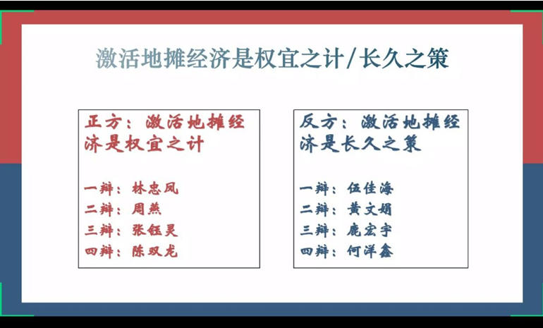 本次比赛正方马克思主义乖巧队成员林忠凤、周燕、张钰灵、陈双龙与反方人间烟火队成员伍佳海、黄文娟、鹿宏宇、何洋鑫围绕辩题“激活地摊经济是权宜之计还是长久之策”展开辩论。