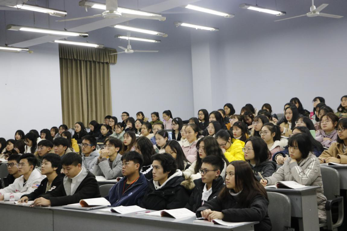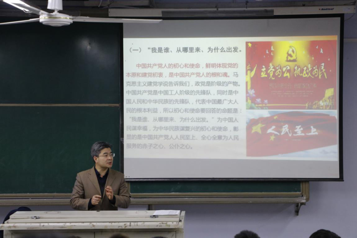 12月16日晚,学校党委副书记、纪委书记张超在博文楼214教室为外国语学院学子讲授“不忘初心、牢记使命”形势与政策课,外国语学院党总支书记王义文、副书记刘天和2019级5、6、7班学生到场聆听。