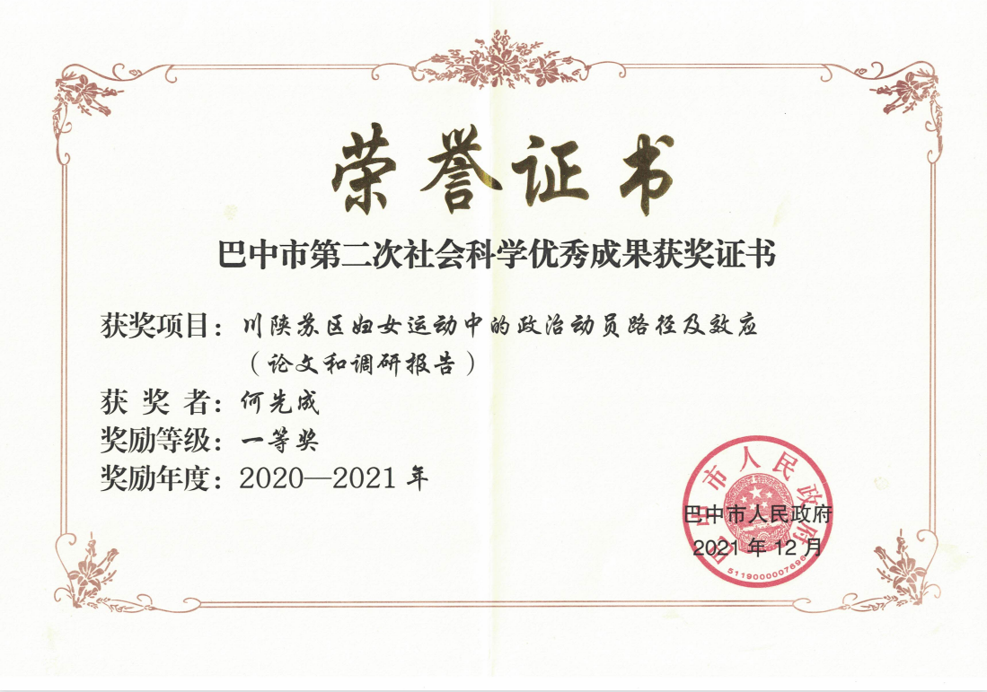 近日,根据巴中市人民政府办公室印发的《巴中市人民政府办公室关于表扬巴中市第二次社会科学优秀成果的通报》(巴府办发〔2021〕19号)文件通知,巴中市人民政府对评选出的62项优秀成果进行表彰。副院长何先成的科研成果《川陕苏区妇女运动中的政治动员路径及效应》荣获一等奖。