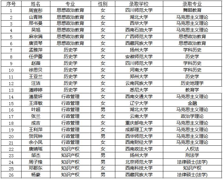 考研传捷报,桃李竞芬芳。我院2022届毕业生考研再创佳绩,26名同学考取北京师范大学、西南交通大学、西南财经大学、澳大利亚悉尼大学等国内外知名高校硕士研究生,考研录取率名列各二级学院前茅。