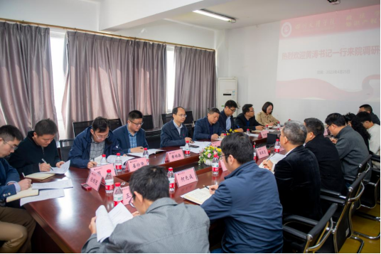 4月25日上午,学校党委书记黄涛一行来院调研指导,于611会议室召开座谈交流会。学院党政班子成员,各教研室主任,基地办公室主任及教师代表参会,会议由学院党委书记岳臣忠主持。