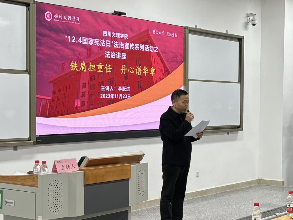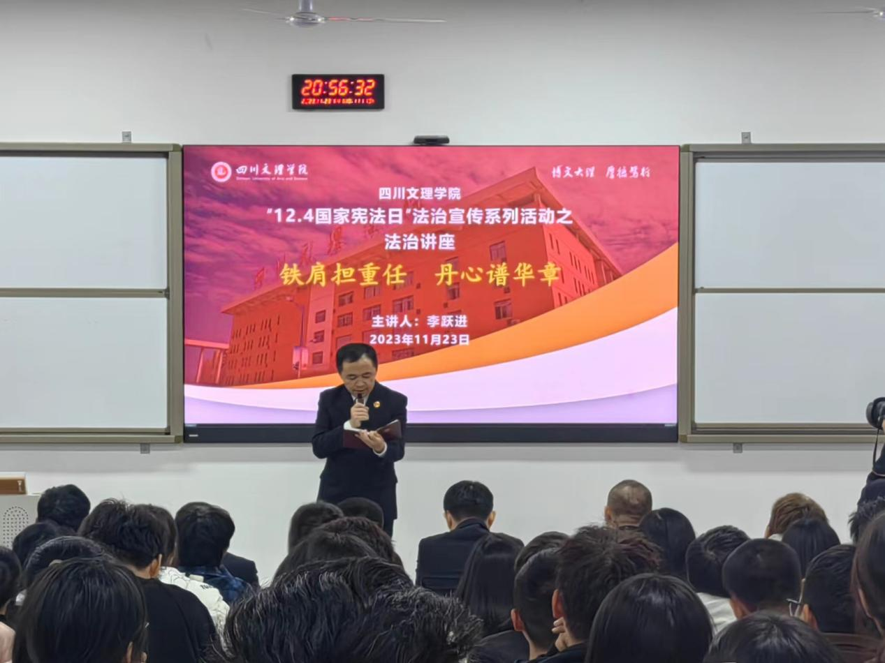 为深入学习贯彻党的二十大精神,认真贯彻落实习近平法治思想和习近平总书记关于宪法法治教育的重要指示精神,根据教育部和省委依法治省办、省委宣传部、司法厅 2023 年“宪法宣传周”工作安排及《四川省教育厅关于举办第八届全省学生“学宪法 讲宪法”活动的通知》有关要求,学校于近期启动了2023 年“宪法宣传周”系列活动。2023年11月23日晚19点,由四川文理学院党委宣传部、科技处、学生工作部、团委主办,政法学院&知识产权学院承办的“宪法宣传周”系列活动之法治讲座在莲湖校区东区A318阶梯教室拉开帷幕。本次讲座由达州市人民检察院第二检察部主任李跃进主讲“铁肩担重任,丹心谱华章”,我院党委书记岳臣忠主持,达州市人民检察院党组成员、政治部主任于蒲出席并作点评。