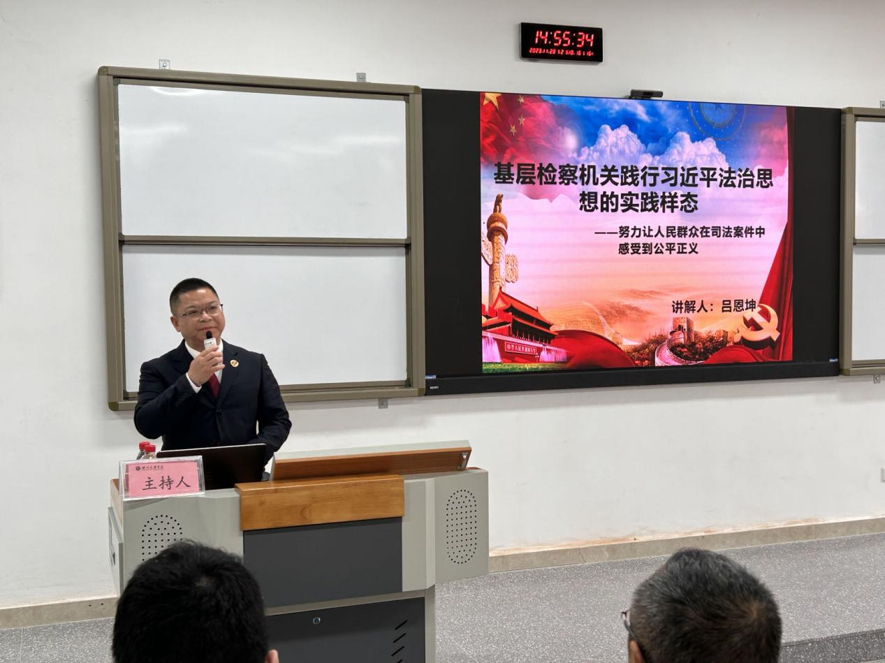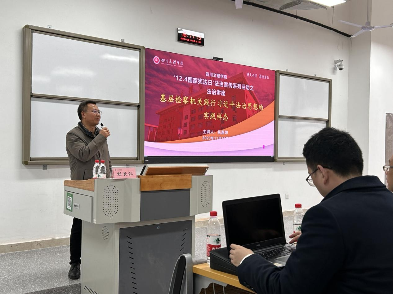 为深入学习贯彻习近平法治思想和做好2023年“宪法宣传周”系列活动,11月28日,达州市达川区人民检察院检察长吕恩坤走进我校,为师生作“基层检察机关践行习近平法治思想的实践样态——努力让人民群众在司法案件中感受到公平正义”法治讲座,政法学院&知识产权学院院长刘长江教授主持本次讲座。