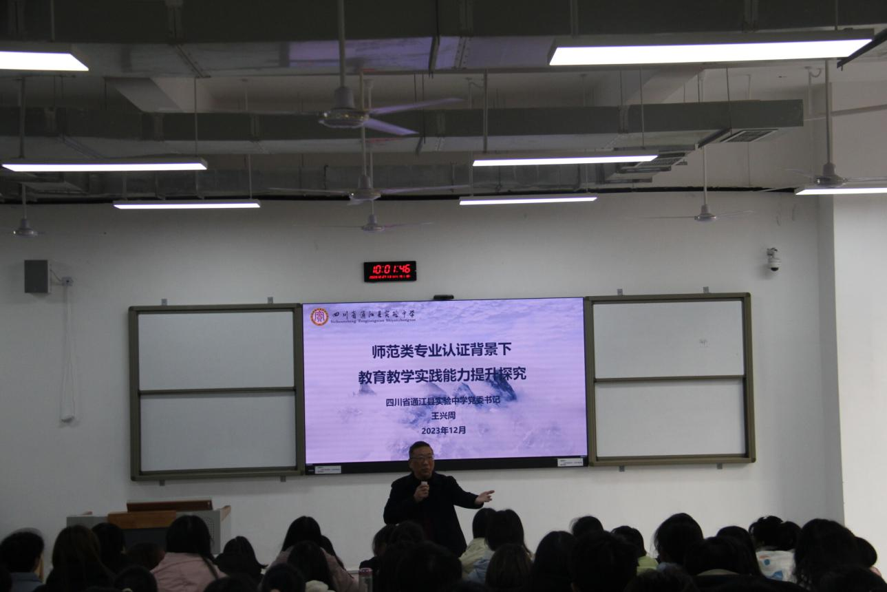 12月27日上午,四川省通江县实验中学党委书记王兴周在东A318进行“师范认证生教育教学能力提升研究”专题讲座,院长刘长江教授主持,我院2021级1班、2023级1班和3班全体学生到场聆听。