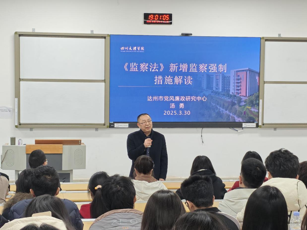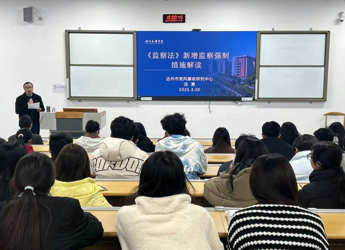 为加强学生对《监察法》的了解,引导学生树立自我约束、端正行为的理念,3月30日晚,我院在东区A318教室举办了《<监察法>新增监察强制措施解读》专题讲座,学校党委巡察办公室主任汤勇教授受邀主讲。讲座由学院副院长何霖主持,学院部分教师以及2023级5班、7班、8班全体学生到场聆听。