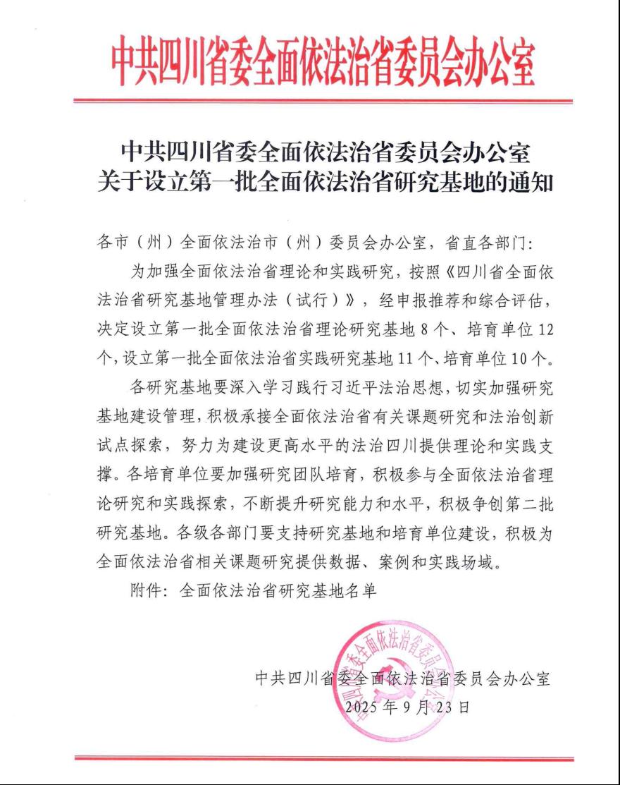 近日,中共四川省委全面依法治省委员会办公室印发《关于设立第一批全面依法治省研究基地的通知》,我院成功入选首批“全面依法治省研究基地”培育单位。