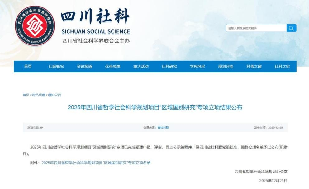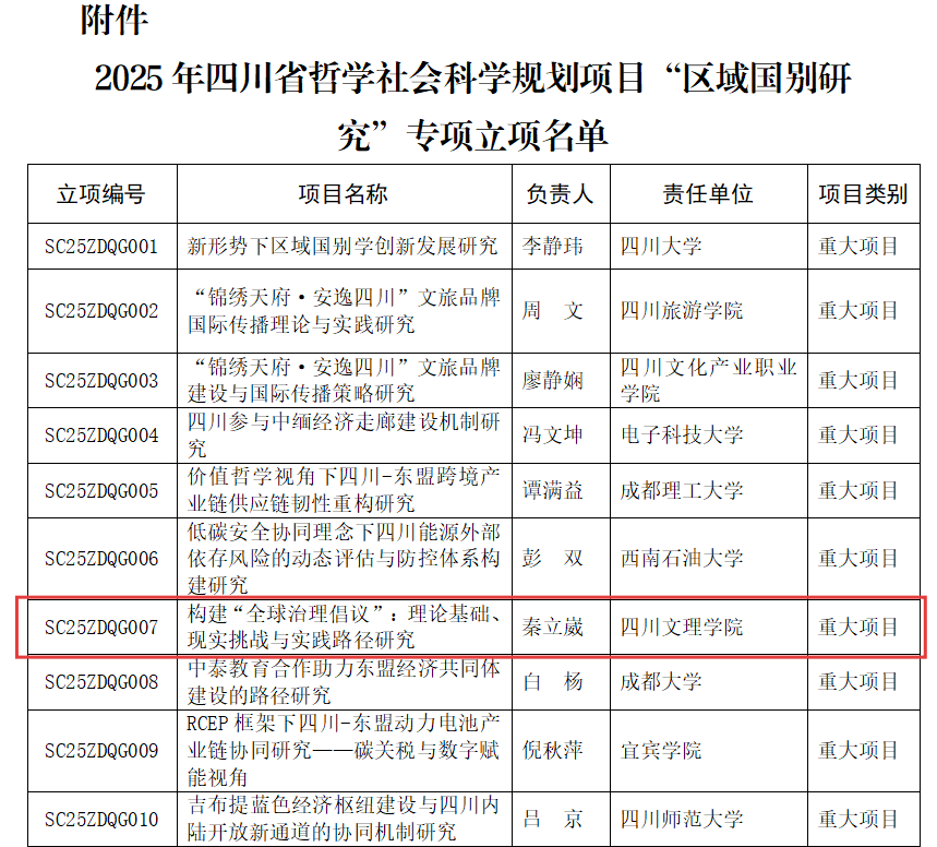 近日,四川省哲学社会科学规划办公室公布了“2025年四川省哲学社会科学规划项目‘区域国别研究’专项立项结果”,我院秦立崴教授主持的《构建“全球治理倡议”:理论基础、现实挑战与实践路径研究》(项目编号:SC25ZDQG007)获批重大项目立项。
