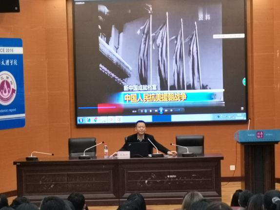 刘长江教授从“为什么要打抗美援朝战争”、“为什么要纪念抗美援朝战争”与“抗美援朝战争留下了什么”三个方面展开讲解。他指出,抗美援朝战争的胜利,是正义的胜利、和平的胜利、人民的胜利,对提升中国国际威望有着巨大意义。抗美援朝战争锻造形成的伟大抗美援朝精神,是弥足珍贵的精神财富,我们必须传承发扬伟大抗美援朝精神。他希望同学们看待历史事件一定要实事求是,遵守“站在历史中看历史”原则,唯有如此,才能如实地还原历史事件。
