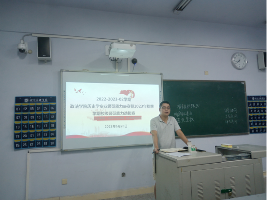 6月28日晚,历史学专业教研室于博文楼519教室举行2022-2023-02学期历史学专业教学能力大赛决赛暨2023年四川文理学院师范生教学能力大赛选拔赛,何先成、张涛、王盟、李媛媛及铭仁园学校初中历史备课组组长秦红五位教师担任此次大赛的评委。