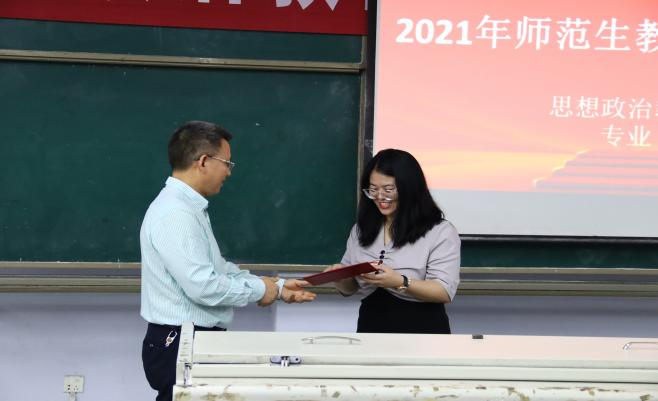 刘长江向外聘教师王莉颁发聘书,并对全体同学提出了三点期望:第一,要不断加强学习的能力,学习新知识,夯实专业基础;第二,要积极主动参加各种赛课活动,不断提升师范技能;第三,要把立德树人放在首位,争取以后做一个优秀的教师。