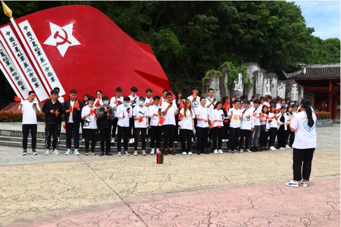 同学们在老师的带领下,怀着崇高的敬意瞻仰刘伯坚纪念碑。在高大的纪念碑前,大家队列整齐,昂首挺胸,齐声高唱《中华人民共和国国歌》,向刘伯坚烈士雕像敬献鲜花并三鞠躬。在那如血一般鲜红的党旗下,莫春梅老师带领党员同志以激昂的斗志、饱满的热情重温入党誓词,铿锵有力、声音嘹亮。
