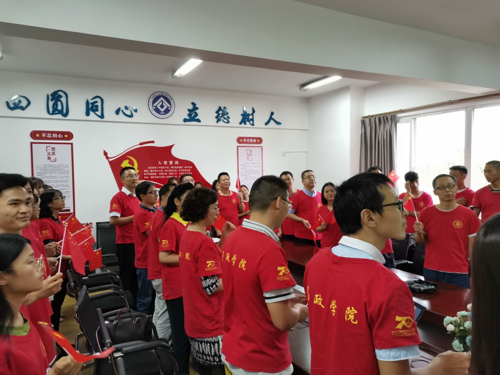 9月30日下午,在举国欢庆中华人民共和国成立70周年之际,结合学校“不忘初心、牢记使命”主题教育,马克思主义学院、政法学院组织全体教师和部分学生开展“我向祖国表白”主题党日活动。