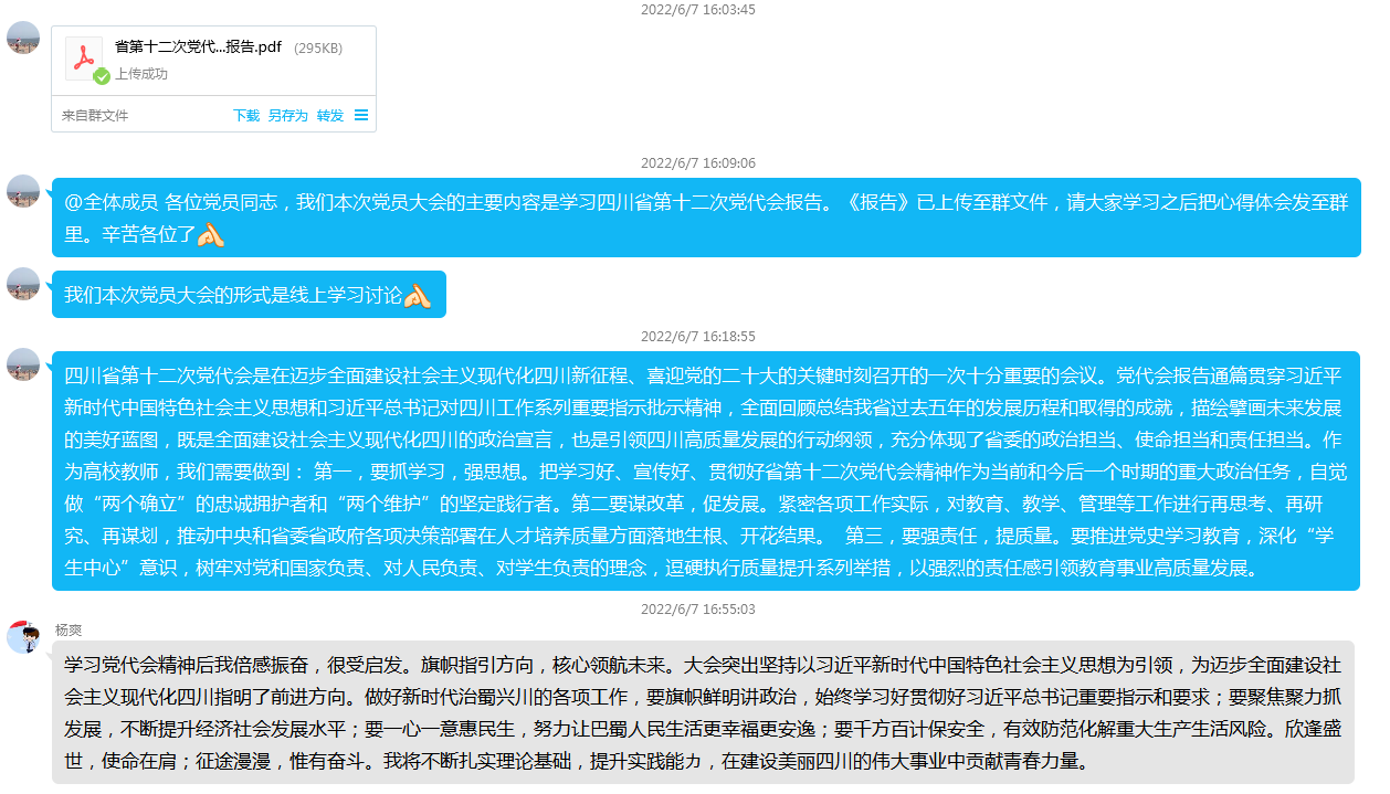 四川省第十二次党代会是在迈步全面建设社会主义现代化四川新征程、喜迎党的二十大的关键时刻召开的一次具有政治性、全局性、时代性的重要会议,从思想上政治上组织上为新时代治蜀兴川事业发展打下了坚实基础。会上,支部党员结合自身实际,纷纷交流学习党代会精神的感悟、收获和体会。大家一致认为,通过线上线下的认真学习,备受鼓舞,感悟良多。作为一名四川普通公民,对过去五年治蜀兴川所取得的成绩由衷地感到自豪和骄傲,这些成绩为全面建设社会主义现代化四川奠定了坚实基础;作为一名公职人员,一定要按照这次党代会的精神,拥护“两个确立”,做到“两个维护”,履行好自己的岗位职责,将任务一项一项落实,将工作一件一件推进,将感动与激情转化为奋进力量和行动自觉,争取为全面建设社会主义现代化四川尽绵薄之力;作为一名高校教师,要抓学习,讲政治,认真备课上课,搞科研和教研,淘汰“水课”讲“金课”,并将这次党代会的精神和要义融入课堂教学之中,尽可能提高教学实效性。
