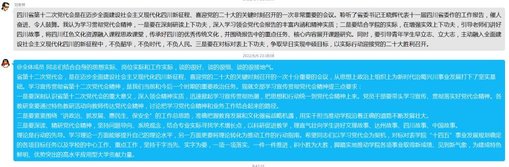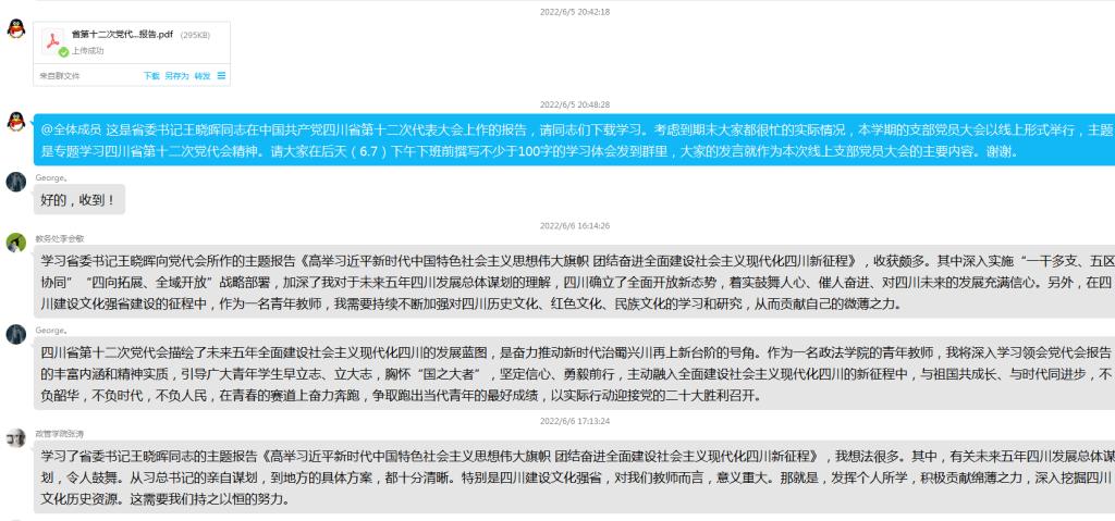 6月6日,政治历史党支部召开线上支部党员大会,专题学习中国共产党四川省第十二次代表大会精神。本次会议由支部书记何先成主持,政法学院、知识产权学院党总支副书记、院长刘长江以普通党员身份参加并与支部党员讨论交流。