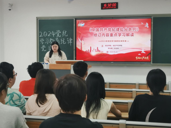 此后,学院知识产权与行政管理支部、思想政治与历史党支部、学生第一支部、学生第二党支部的各位支部书记分别开展主题为“严守纪律规矩,落实立德树人根本任务”“如何根据《处分条例》对生活奢靡、铺张浪费等行为进行认定”“严守纪律规矩 强化使命担当”“心有所戒,行有所止”的党课宣讲活动。