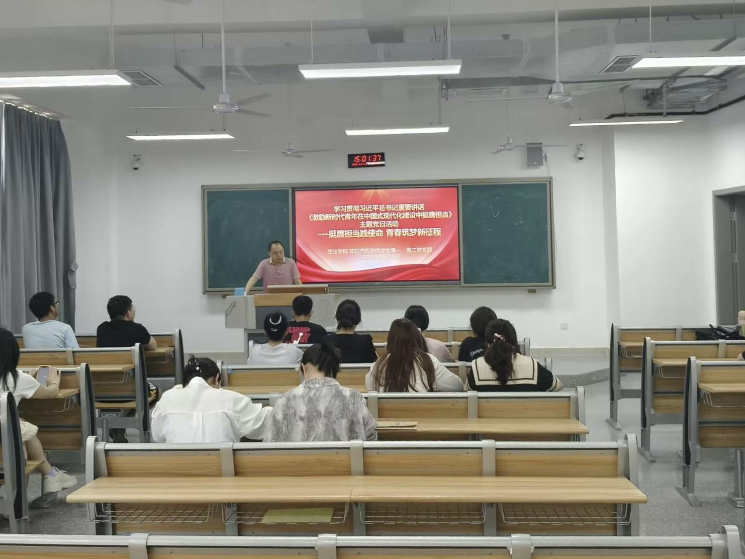 为深入学习贯彻习近平总书记《激励新时代青年在中国式现代化建设中挺膺担当》重要讲话精神,引导学生党员深刻理解新时代青年在中国式现代化建设中的责任与使命,近日,政法学院、知识产权学院学生第一党支部、学生第二党支部在莲湖东区B310教室开展“挺膺担当践使命,青春筑梦新征程”主题党日活动,学生第一党支部书记唐幸福主持。