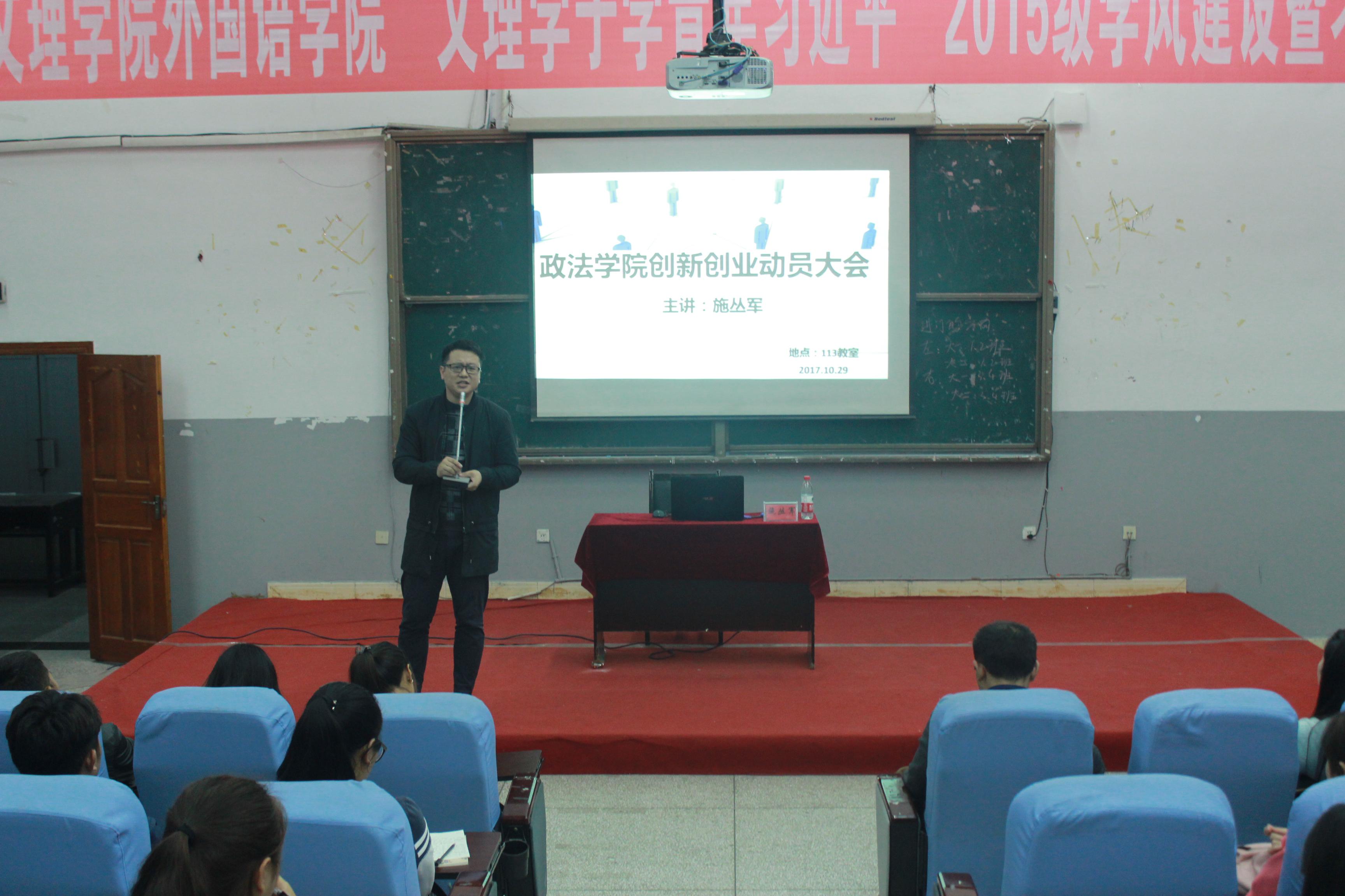 为进一步营造创新创业氛围,激发同学们的创新创业意识, 10月29日19时,政法学院在一教楼113教室召开大学生创新创业动员大会。原数财学院10级校友、通川区启智培训学校执行校长、通川区青年企业家协会副会长施丛军应邀出席,党总支副书记张善喜、大一全体同学和大二入党积极分子参会。会议由辅导员刘丹主持。