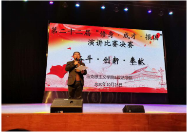 10月26日晚,我院在文传楼多功能厅举办以“奋斗•创新•奉献”为主题的第二十二届“修身•成才•报国”演讲比赛决赛。党总支书记刘春辉、党总支副书记吴辉兵、学工办主任唐幸福、兼职辅导云文茂群老师、侯麟军老师、杨建霞老师、往届优秀选手刘月担任评委,2020级全体学生到场观看比赛。
