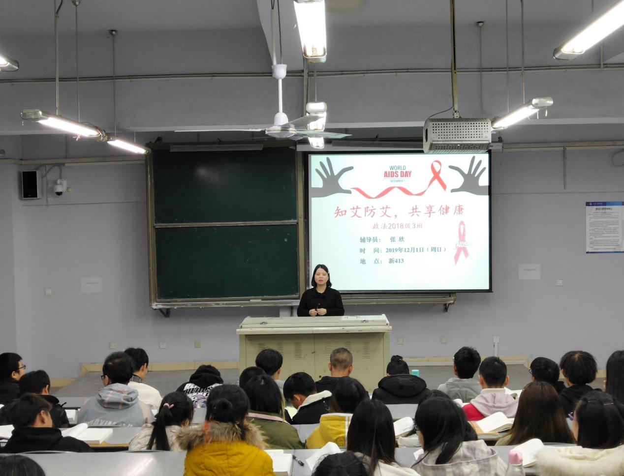 各班的辅导员通过关于艾滋病的视频直观地向大家展示艾滋病的感染过程以及危害,并向同学们讲解艾滋病的概念、传播途径、防护措施。辅导员以提问、互动等方式检测同学们对艾滋病相关知识的掌握情况,同学们积极回应,踊跃发言,表达了自己对艾滋病的认识和看法。辅导员要求学生不歧视艾滋病人,要关爱艾滋病人,同时,要自尊自爱,学会自我保护,远离毒品,避免感染艾滋病毒。