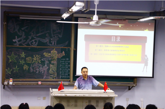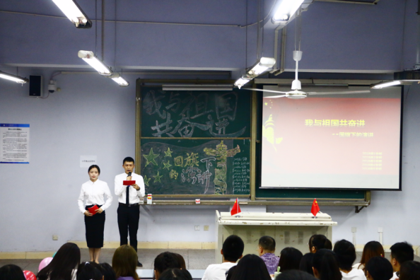 为隆重庆祝中华人民共和国成立70周年,大力唱响礼赞新中国、奋进新时代的青春主旋律,2019年9月7日我院在博文楼124教室举办了以“我与祖国共奋进——国旗下的演讲”为主题的团日活动。学工办主任唐幸福老师、学生会主席蔡润禾、团总支组织部部长徐汝岚等学生干部及2018级全体同学参加了活动。
