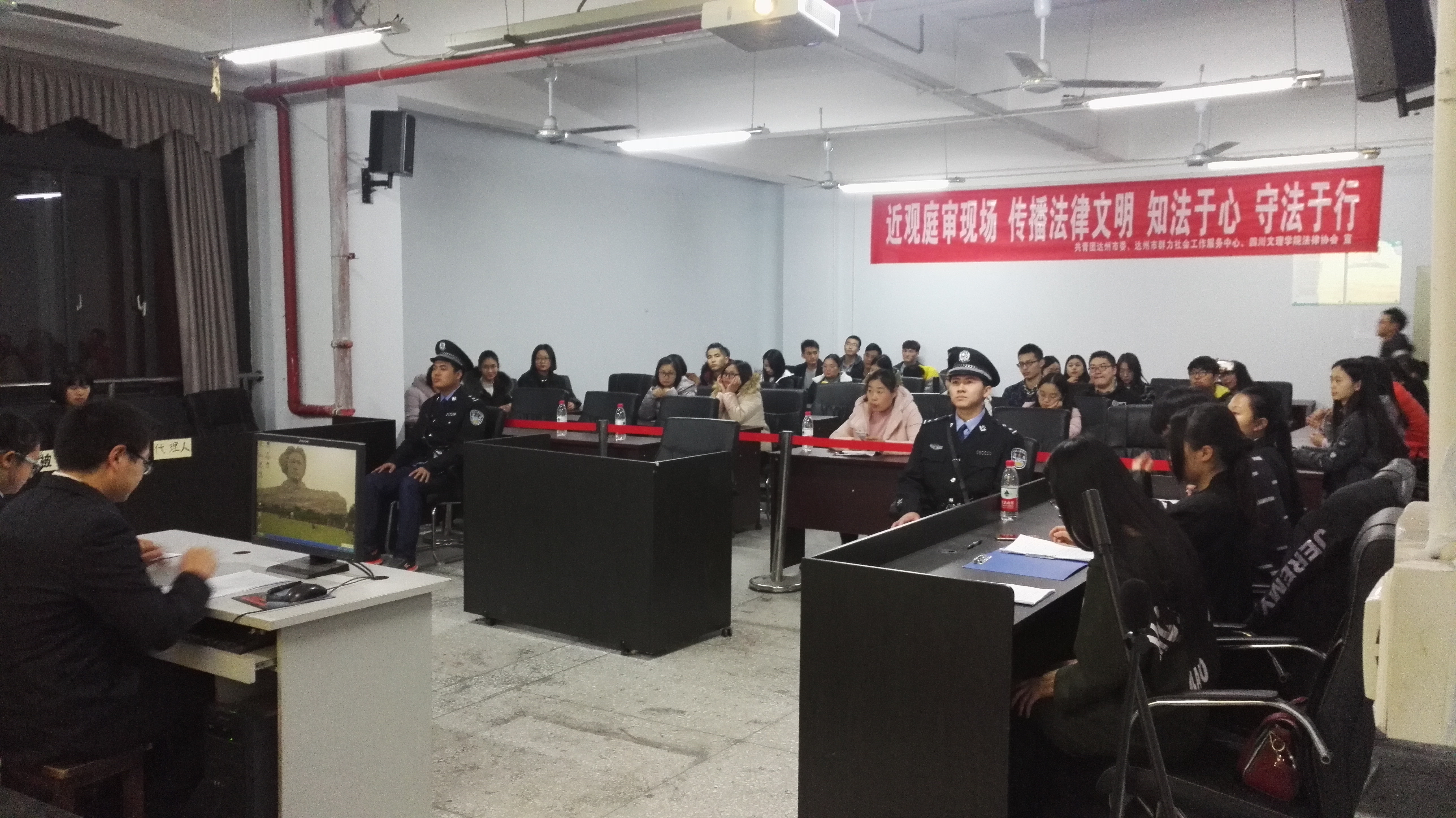 宪法是国家的根本大法,是治国安邦的总章程。为大力宣传"12·4"宪法日,“学习贯彻党的十九大精神维护宪法权威”,直观体验法庭审理过程,促进理论与实践统一,提高学生的知识素养,我校法律协会与共青团达州市委、达州群力社会工作服务中心于12月4日19时在图书信息大楼605模拟法庭实训室合作开展了“12·4”模拟法庭活动。