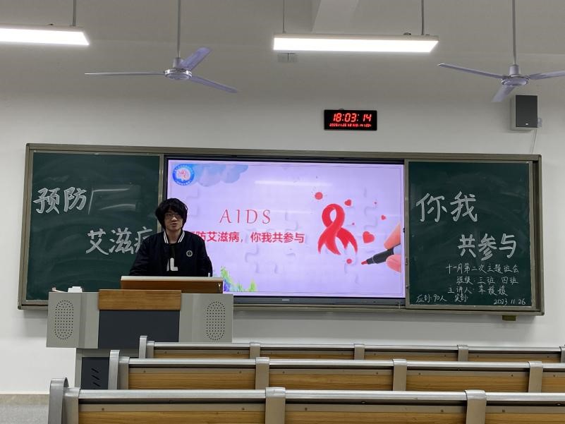 班会上,各班结合图片、视频以及案例等,就艾滋病的定义和起源、艾滋病三种传播途径、艾滋病的症状表现和预防等方面进行了详细地讲解,并通过知识问答让同学们对艾滋病有了进一步的认识和理解。最后,各班辅导员强调,重视、预防艾滋病刻不容缓,要求每位同学在生活中要充实对艾滋病知识的了解,提高预防艾滋病的意识,同时要洁身自好,倡导健康生活,践行文明风尚,并以理解包容的心态对待艾滋病患者,共同营造宽容的社会环境。