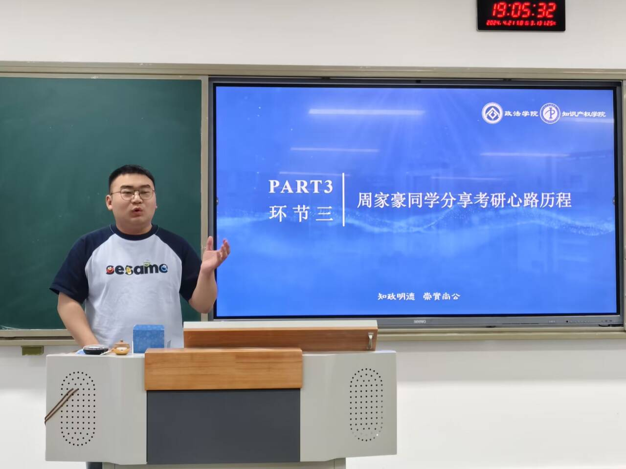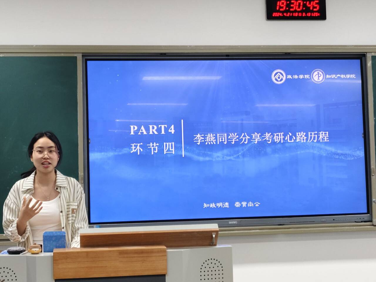 追风赶月莫停留,平芜尽处是春山。为提高行政管理专业学生学习热情,帮助考研学子正确择校、科学复习,以昂扬的姿态在考研之路上高歌猛进,4月21日18:30,政法学院知识产权学院2021级3班、2022级5班在莲湖校区东区B504联合举行考研动员暨经验分享交流会,杨松林等4位2020级考研高分上岸的优秀学子作为主讲人,倾囊相授了自己的备考经验。学院党委副书记刘良训主持分享会。