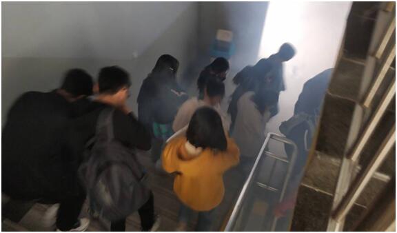 演练开始前,全体同学在指定教室集合,各班班长领学消防知识要点,做好疏散准备,等候下发疏散演练指令。在演练总指挥发出疏散演练指令后,由团学干部拉响警报,并释放模拟火灾烟雾。当同学们听到警报后,迅速地撤离教室,快速有序地从楼梯口疏散,全体师生在博文楼正门前进行集合。