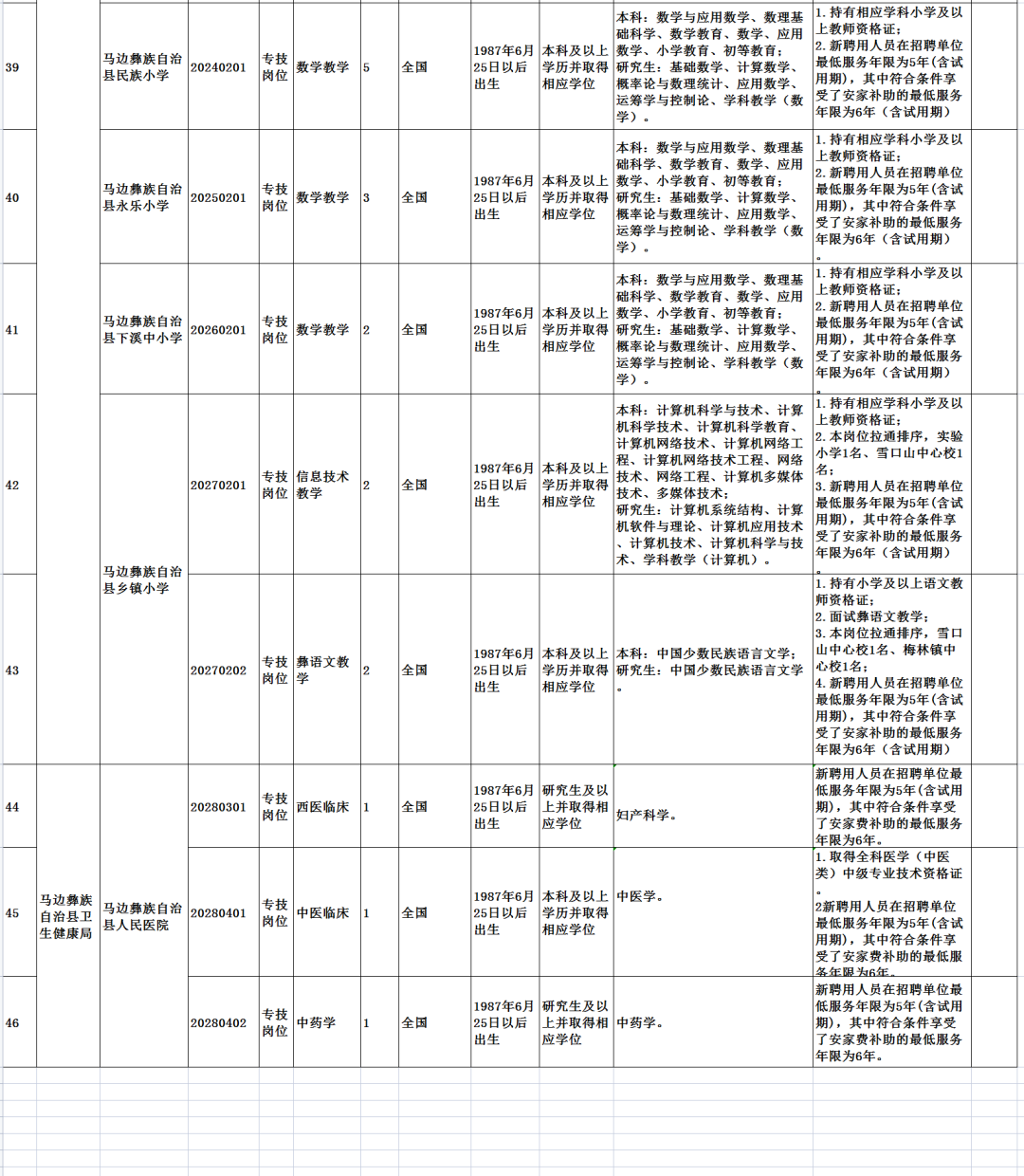 (3)参加“三支一扶”志愿者、“大学生志愿服务西部计划”志愿者定向考核招聘的须截止2023年9月30日前在马边彝族自治县服务期满两年、且年度考核均为合格及以上;