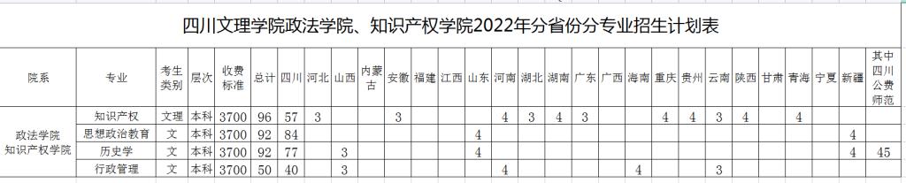四川文理学院政法学院、知识产权学院2022年分省份分专业招生计划表