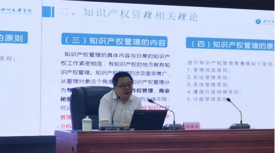 为进一步提升全市基层管理人员的知识产权保护意识,推进知识产权保护工作,2024年6月20日,我院教师、四川省知识产权培训(四川文理学院)基地办公室主任谢腾欧应邀在市委党校为“全市乡镇(街道)党(工)委副书记培训班”做“知识产权管理赋能乡村振兴”专题讲座。